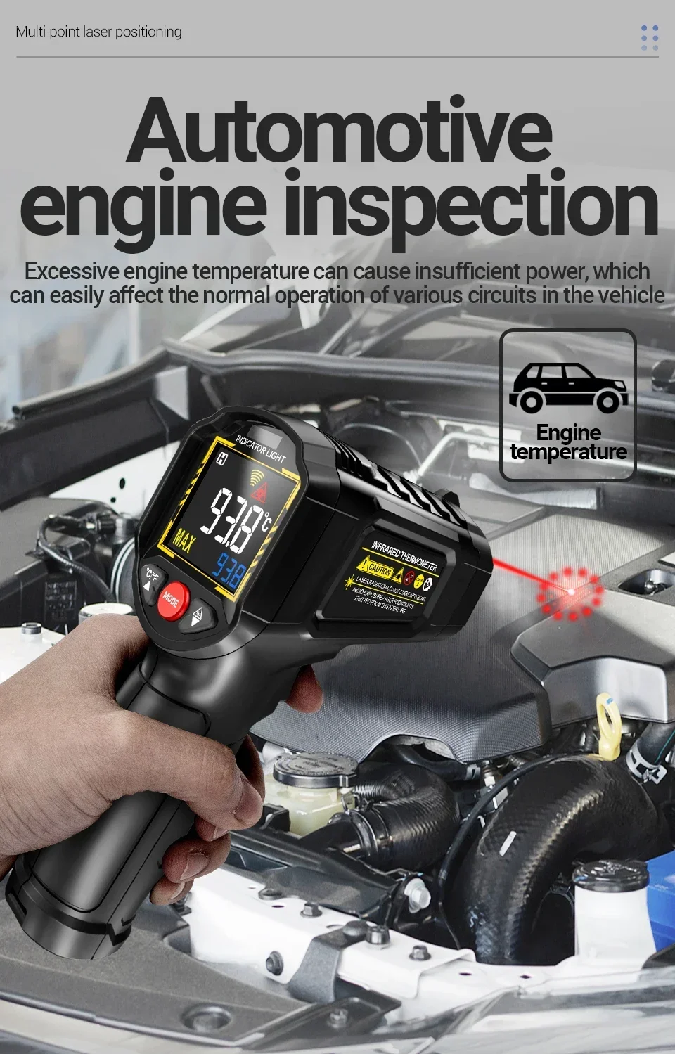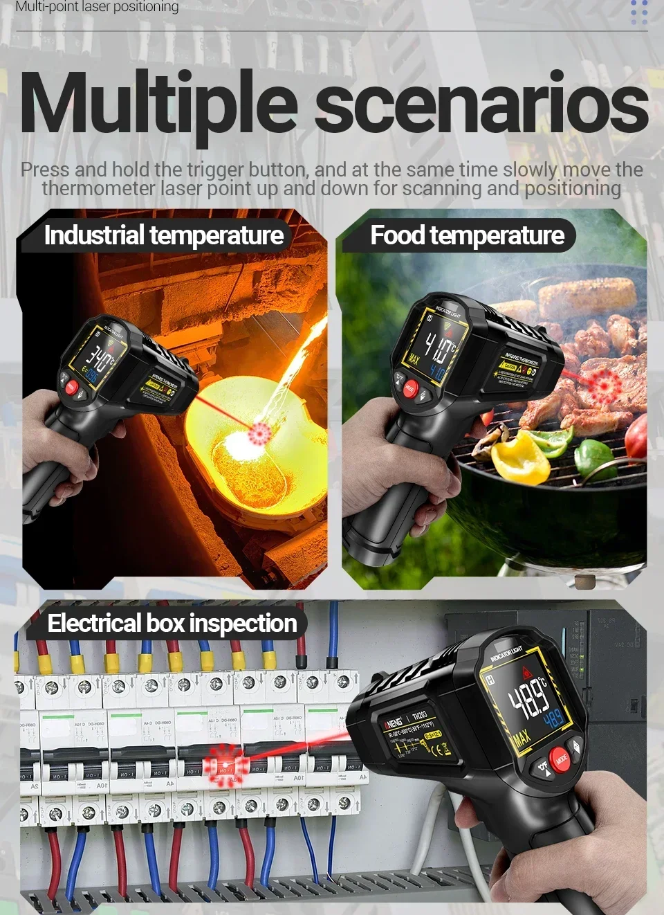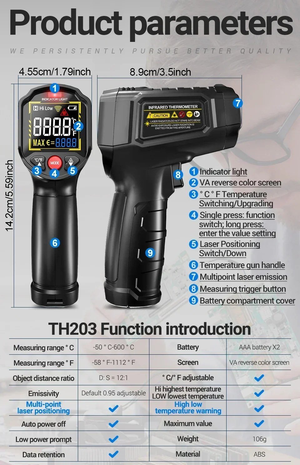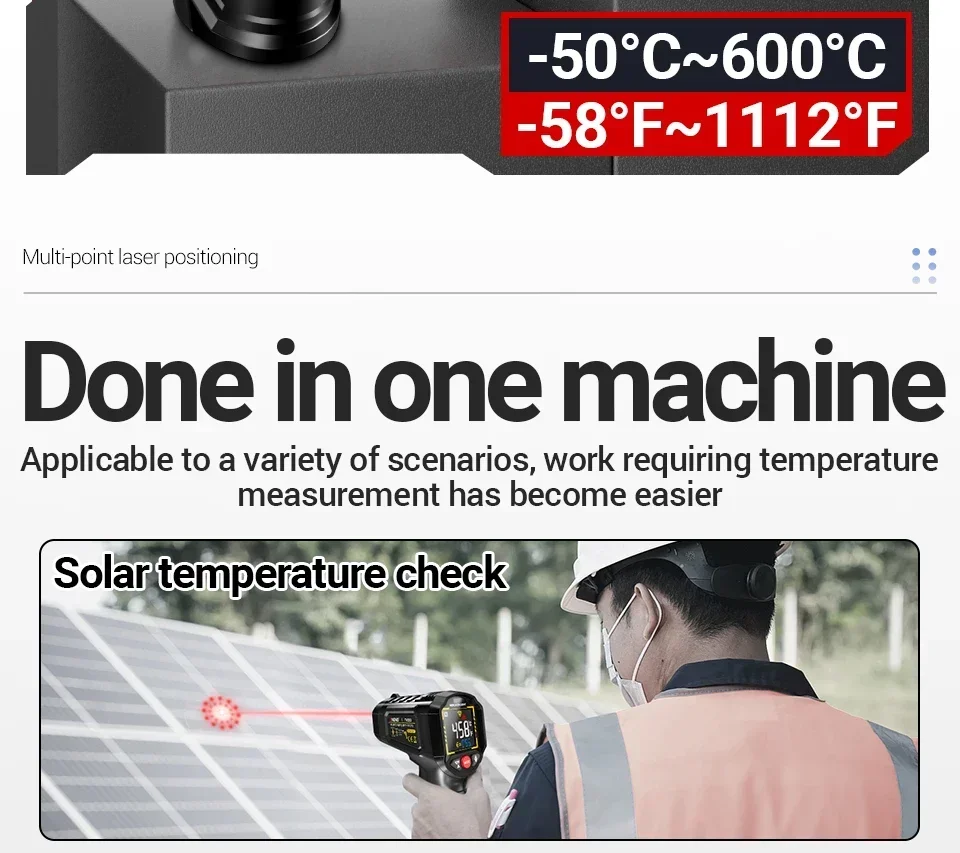 The ANENG TH203 Digital Infrared Thermometer delivers professional-grade temperature measurement safely and instantly. Engineered for industrial, HVAC, and workshop use, it offers three key benefits. First, its high 12:1 distance-to-spot ratio allows for accurate readings of small or hazardous targets from a safe distance. Second, the clear VA reverse color screen and multi-laser targeting ensure easy visibility and precise aiming in any lighting. Third, with adjustable emissivity and a wide -50°C to 600°C range, it provides reliable data for diverse materials and extreme temperatures. This feature-packed, non-contact tool is your essential solution for efficient diagnostics and maintenance. (CE Certified).