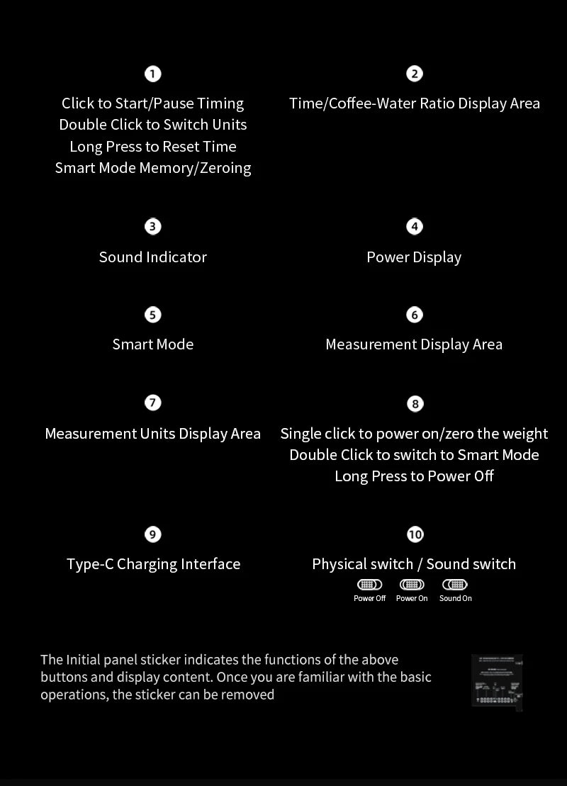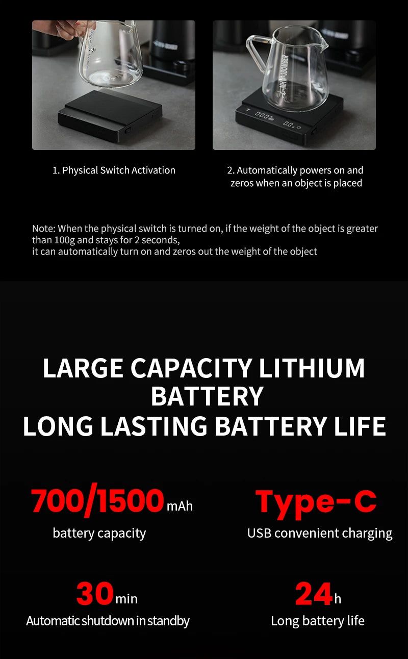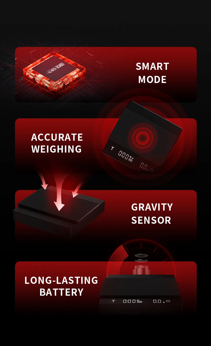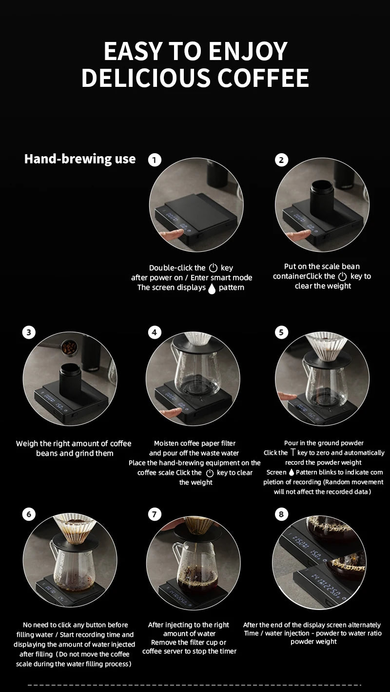 A Smart Choice: New upgrade smart mode, embedded with a "solid liquid detection" function of the chip (can automatically identify the water flow into the user during brewing/extraction, so as to start timing and calculate the injection volume/liquid weight) in the process of use, effectively avoiding the inability to carry out the rest of the operation due to mistaken touch or change of filter cups, coffee server, etc.