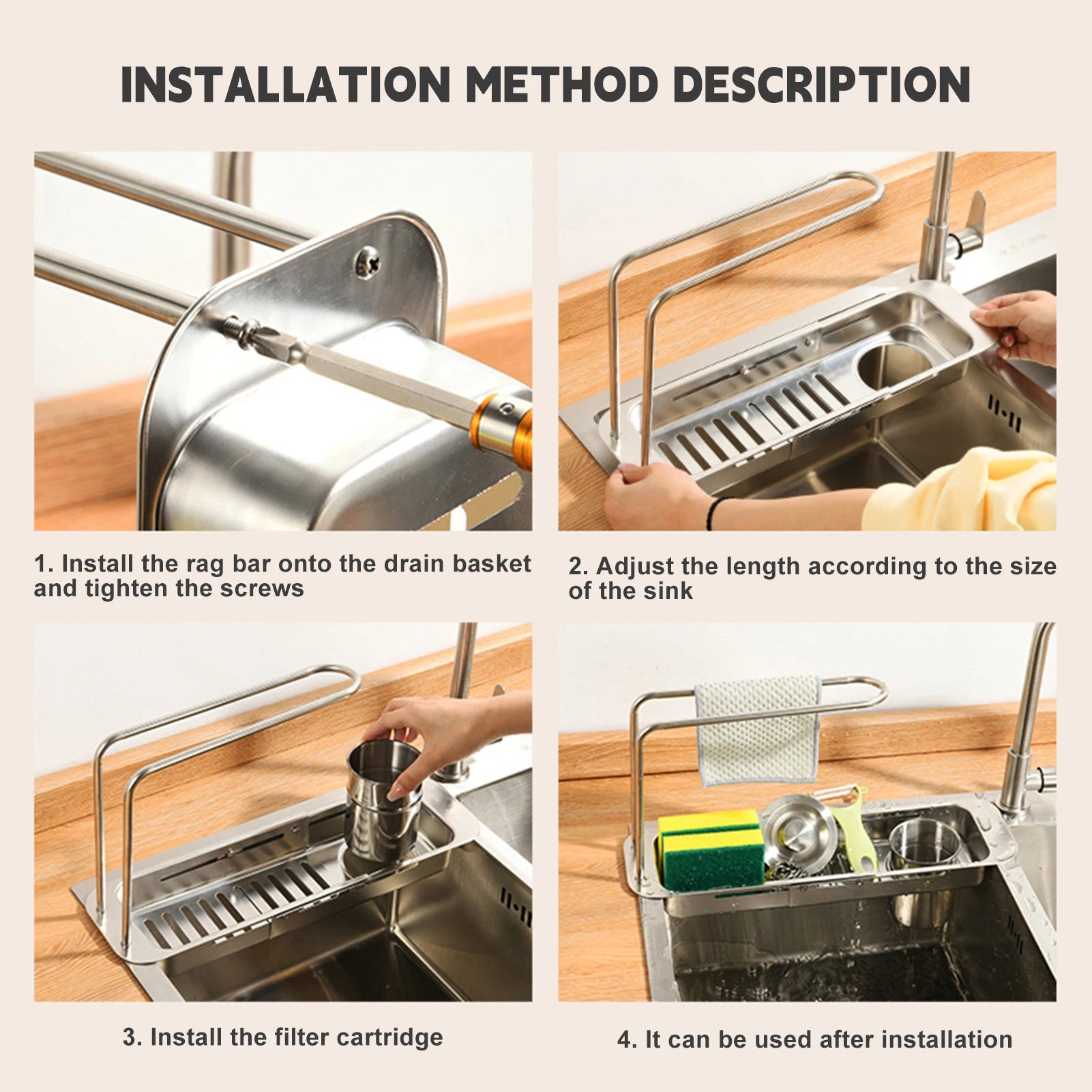 3. Large Capacity: Upper hanging rag, lower layer cleaning appliances, orderly placement, easy to clean and access. Bottom evenly drain hole, wash tableware can also be placed to drain.