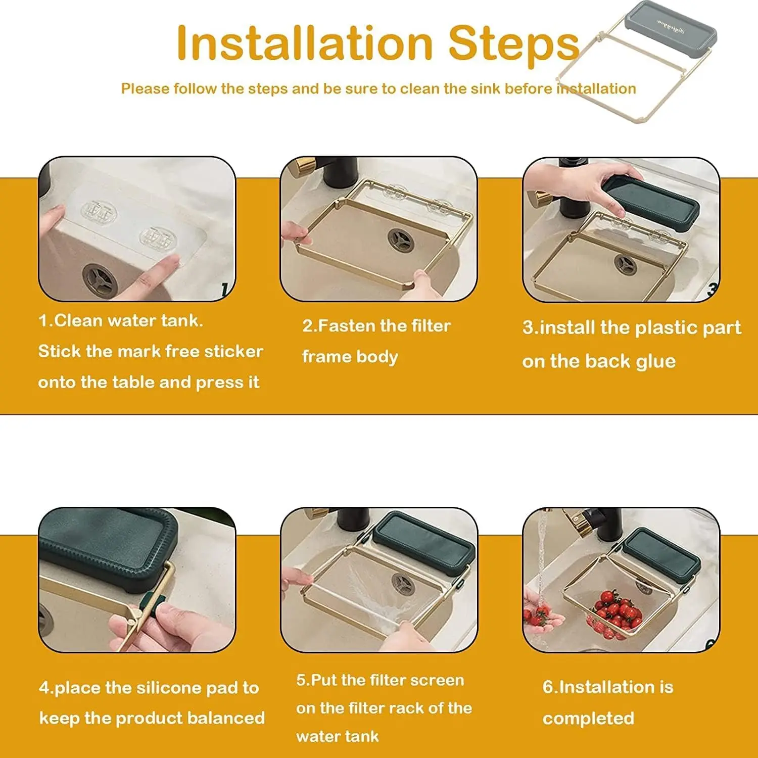 EASILY INSTALLATION ----- Stick the base, then mount the rack, green cover and pads. Finish! The kitchen sink strainer fits for most sinks and is flexible to install on any side of the sink. The rack comes with 2 rubber pads that won’t damage sink countertop.