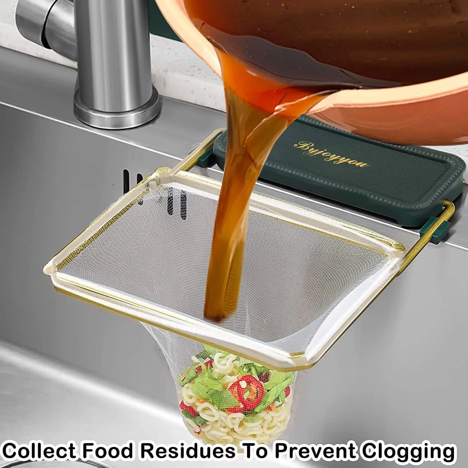 PREMIUM QUALITY ----- The sink trash catcher is made of iron and plastic. The filter bag is sturdy and has a big load-bearing capacity. Package includes 100pcs mesh bags.