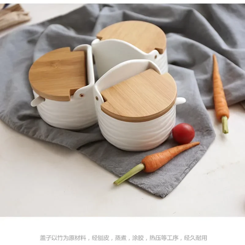 Kitchen Spice Rack Ceramic Wooden Lid Bamboo Tray Base Seasoning Pot Tool Porcelain Storage Container Set Convenient Salt Pepper