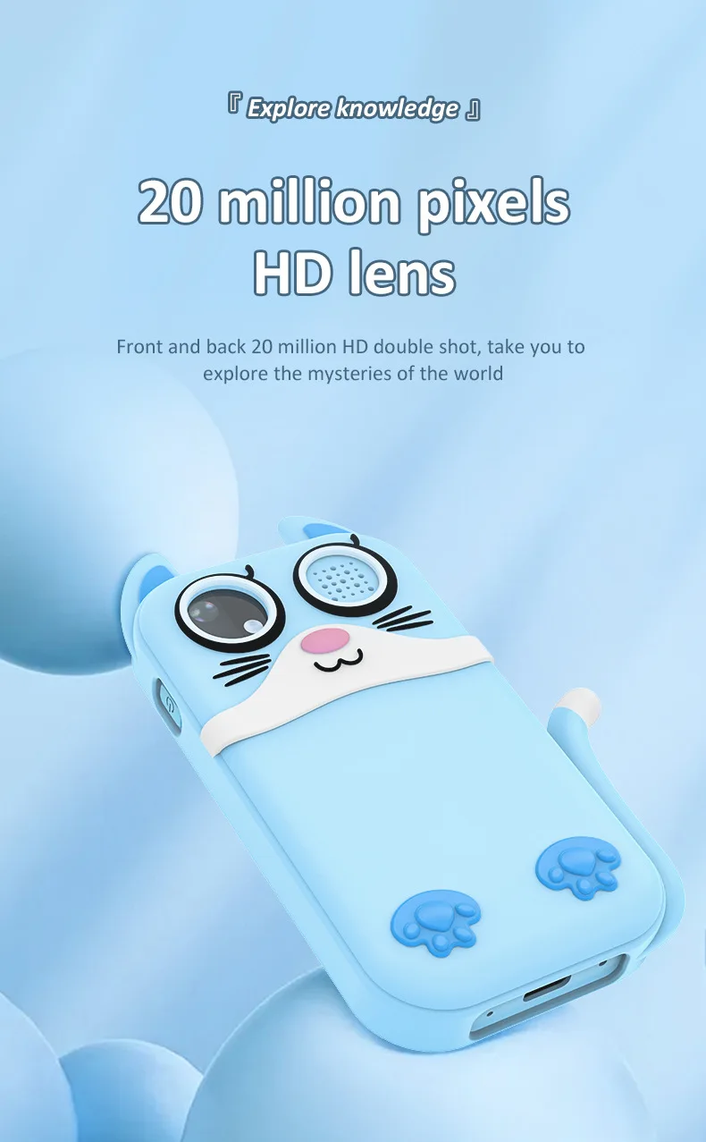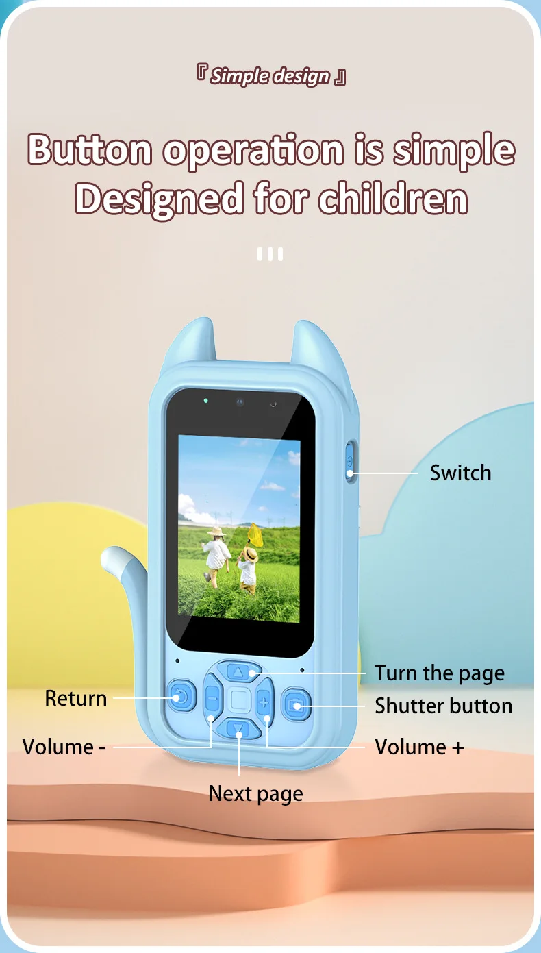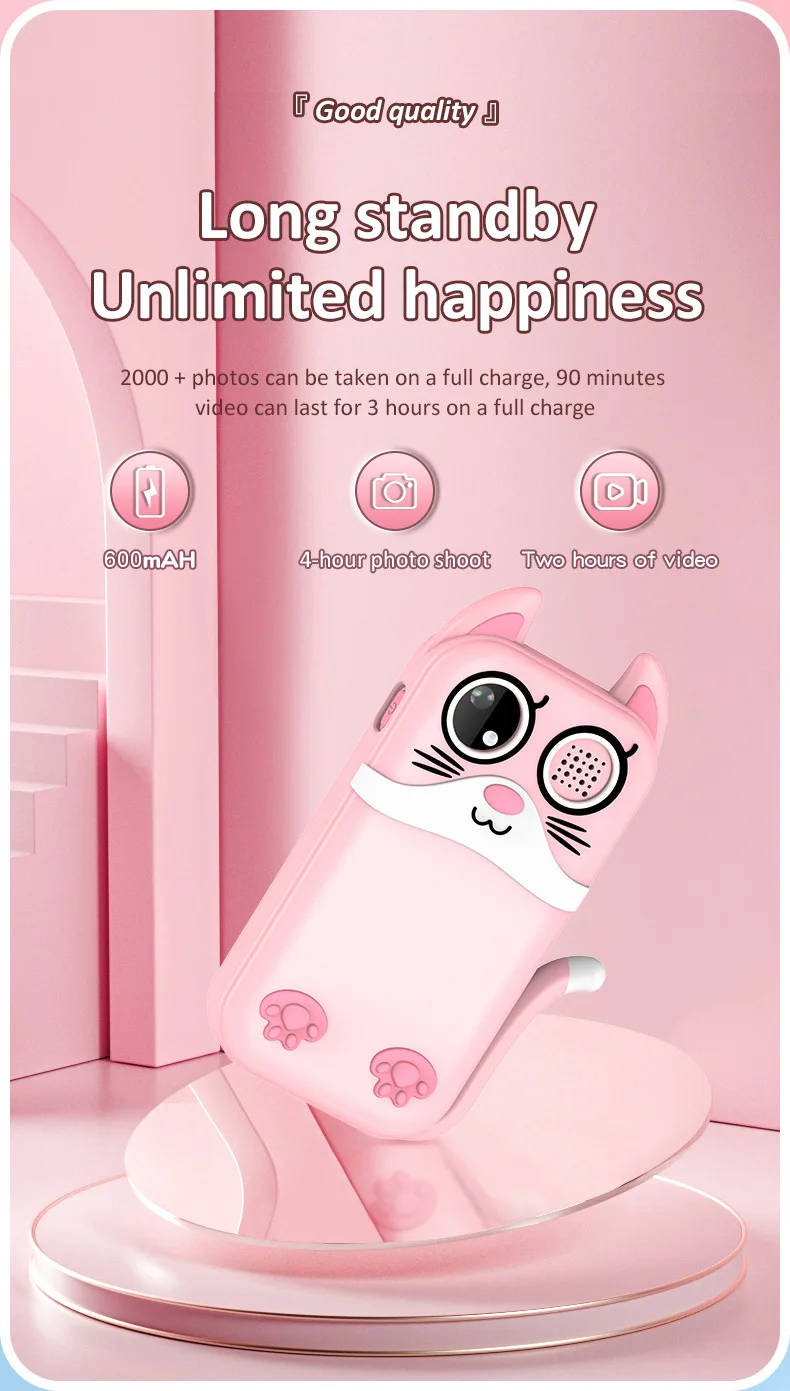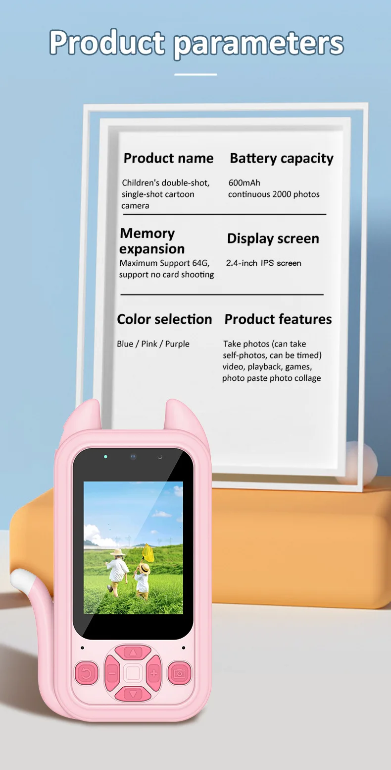 This versatile digital camera for kids features both front and rear lenses for photos & videos, plus fun educational games. Made from safe ABS plastic with a 600mAh rechargeable battery, it includes a lanyard and charging cable. Perfect as a creative, screen-free gift for children ages 3+ to explore photography and play.